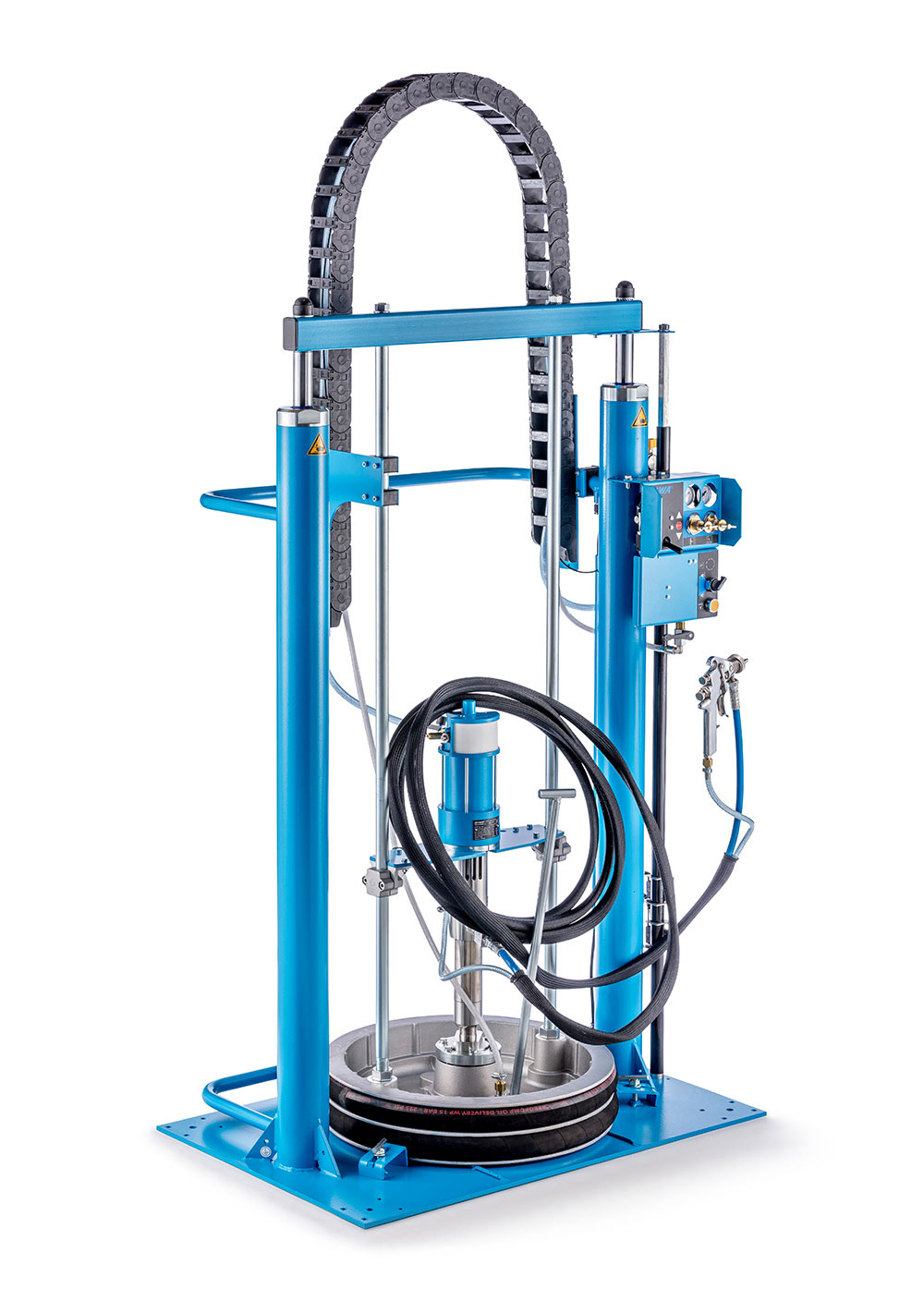 Auf einer Zweisäulenramme und mit einer ND-Pumpe im Kern eignet sich diese Systemlösung optimal für ein bis zwei Abnahmestellen mit höherem Verbrauch. Je nachdem, ob Sie einen Sprüh- oder einen Extrusionsauftrag haben, beinhaltet dieses System eine Dickstoff- oder eine Extrusionspistole.